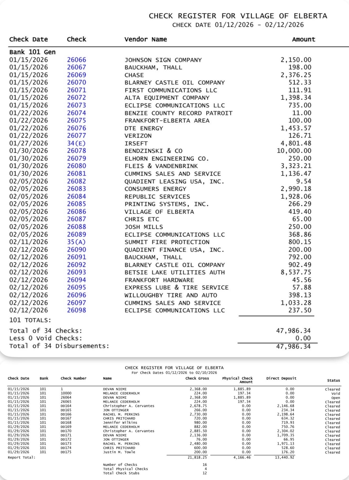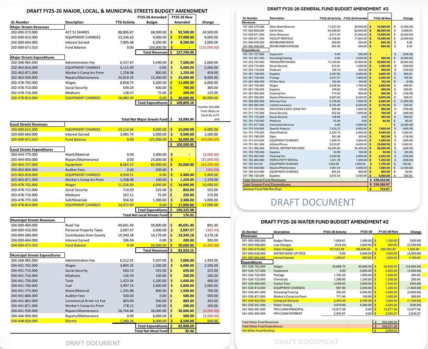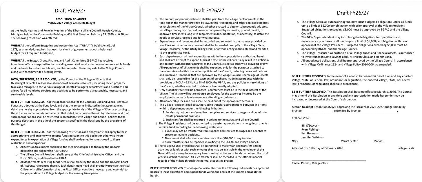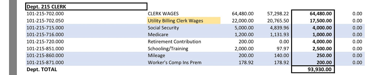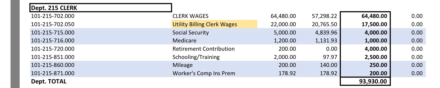 Emily Votruba: [I also submitted questions in advance and asked a shorter (but not by much) version at the meeting.] “Nothing against the clerk, I think she’s doing a great job, but normally when someone gets a raise above the cost of living there’s some sort of justification for it. I haven’t seen anything in the Personnel minutes or anything that describes an increase of duties. According to this budget she’s going to be getting a 14% raise [from $55,920 (this is including health stipend) to $64,480]. I just want to see what the rationale is. I’m sure there is one. I just would like to see it. Also the utility billing clerk wage has gone down [$22,000 to $17,500] and I’d like to know why that is; are there fewer hours, was it discovered that the job doesn’t take as long…. It was mentioned in a budget meeting that the water fund is in deficit, I would like to know by how much. The Village is consistently cited in audits for having material weaknesses in segregation of duties and internal controls, and that was part of the decision to hire a full-time clerk and treasurer in December of 2024. I would like to know how the decision was made to go from a full-time treasurer to a part-time treasurer. I never understood how that decision was made. We had made a point of passing an ordinance to create a full-time treasurer, and all of a sudden we have a part-time treasurer, so how did that happen. If a contractor [such as the code enforcement officer, who is budgeted to receive $3,500] chooses not to accept payment for services rendered, how are those funds reallocated? And I noticed there’s no resolution in the packet to allow officials to draw a wage to perform employee duties, so I assume this means that will not be allowed in the case of an emergency; is that not going to happen anymore? And finally, it seems that the Village Manager is a new official position, and I believe you cannot do that without an ordinance, so I don’t see how this [new department] can go through on the budget tonight.”