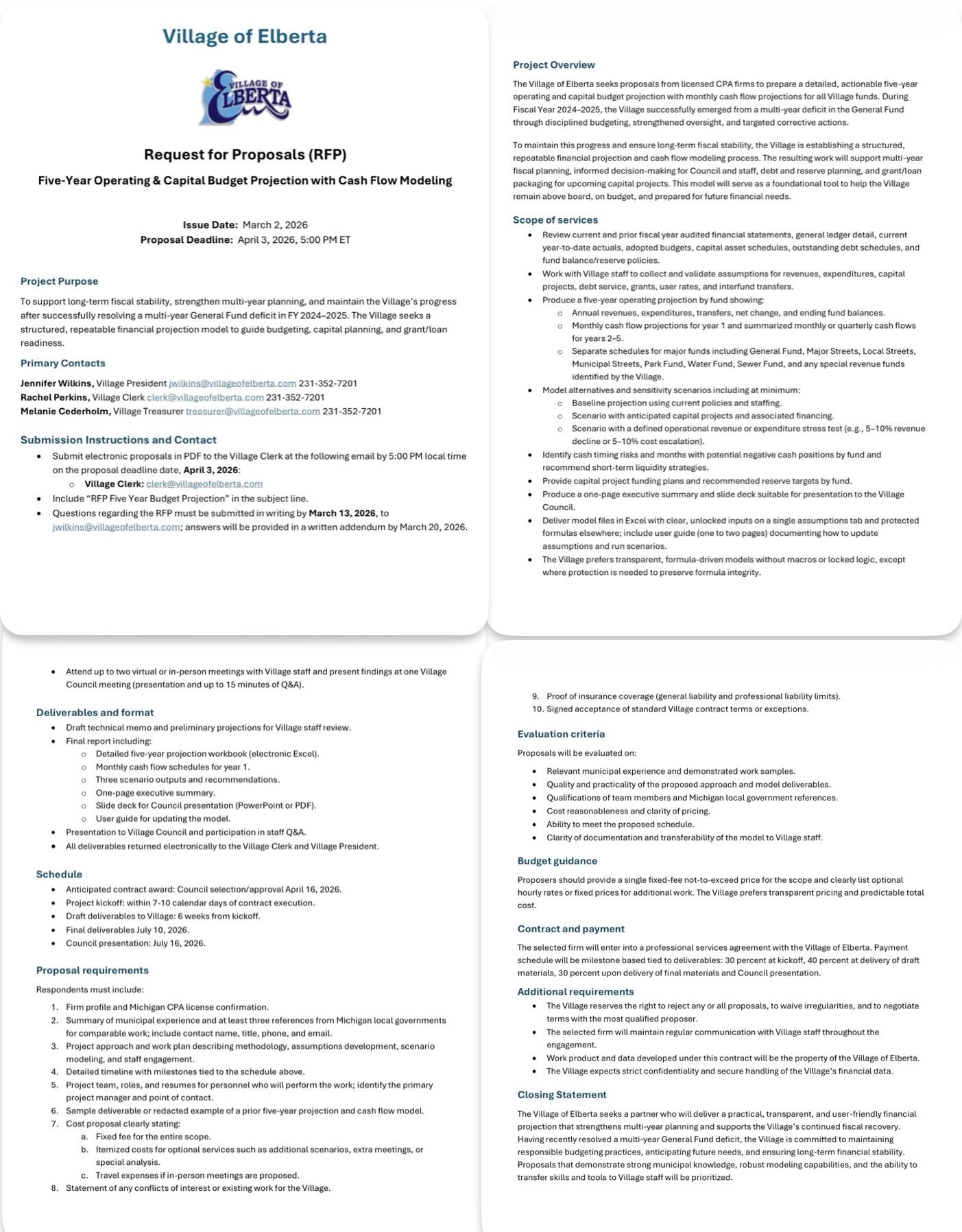 “This will help us support long-term fiscal planning. It will strengthen the Village’s ability to prepare for future infrastructure needs, and it will ensure continued financial stability following the successful resolution of the general fund deficit. This RFP outlines clear deliverables, including transparent formula-driven models, scenario analysis, and a user guide to support staff and council in budget development. This was reviewed by the Village attorney and I’m looking for a motion to approve the request and have the clerk issue the RFP to licensed CPA firms,” read the president. “Side note on this is I will run it through State Treasury for funding. We’ve already done that with codification, so this will be another one.” Council voted in the affirmative. “When council selects a CPA firm, then the president will submit a request for funding to State Treasury,” the president said.