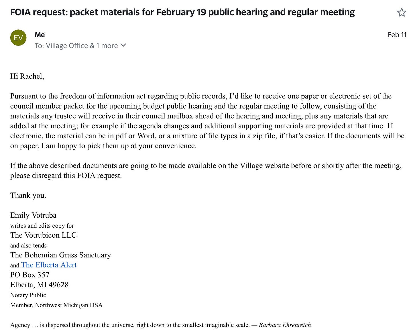The clerk provided the packet materials referenced in this report very promptly after I submitted a FOIA request. Since all these documents are matters of public record, I can share them with you, so if there’s something you’d like to see that I haven’t shown here, let me know! Or you can put in your own FOIA request. Here’s the email I sent: