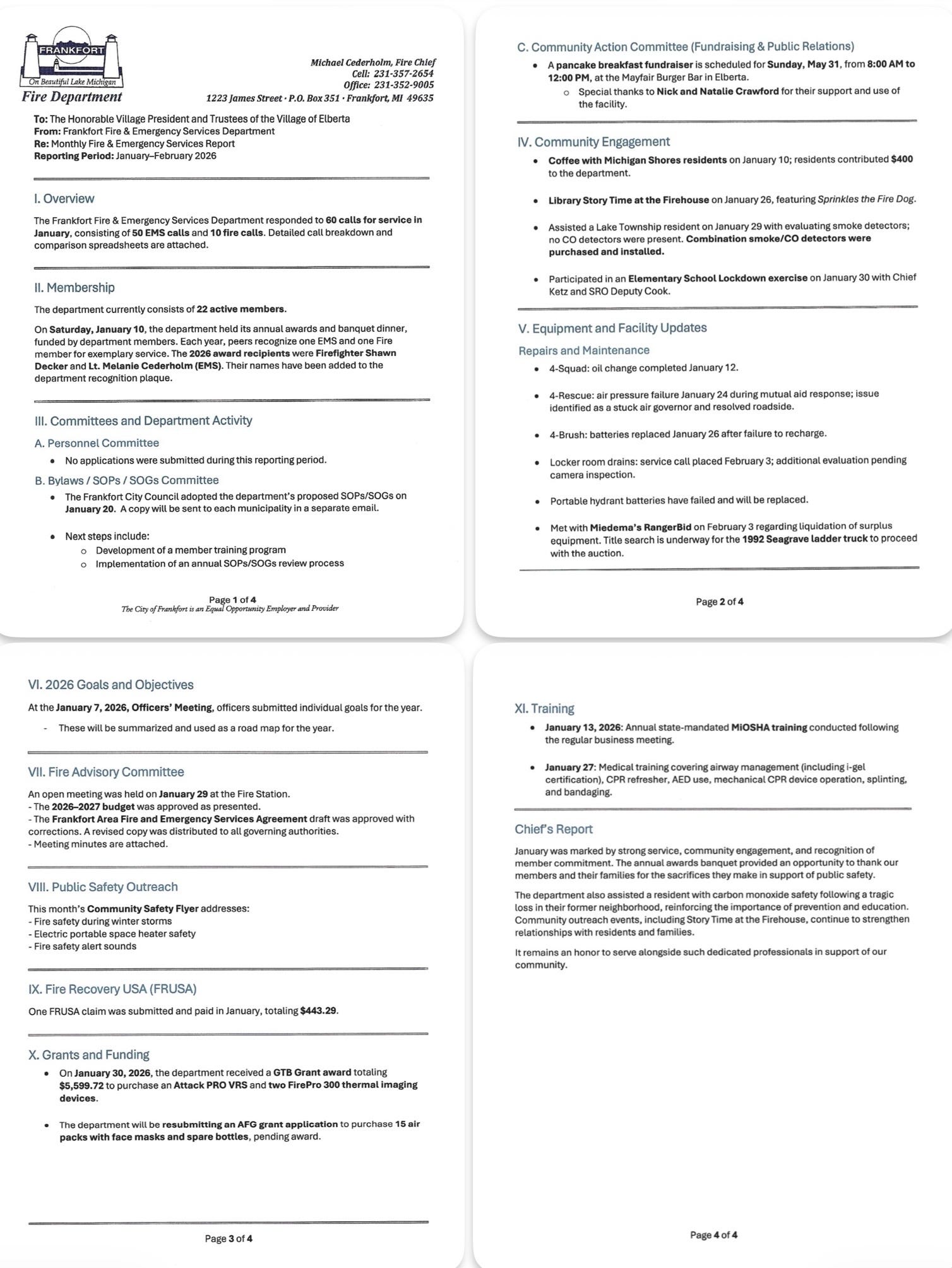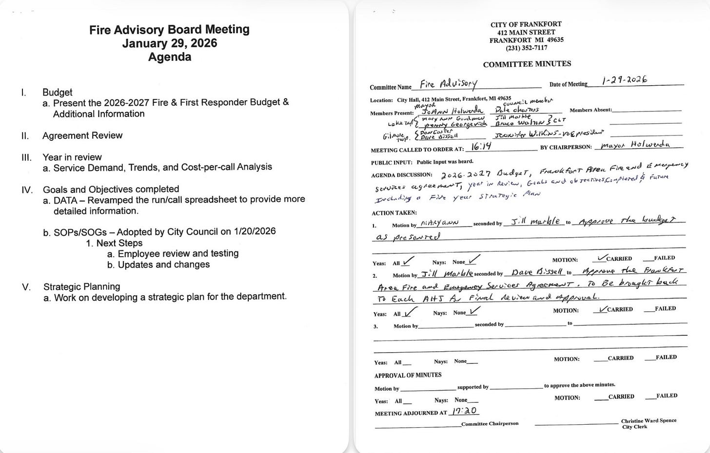 Ten members of the Fire Advisory Board (Maryanne Goodman and Penny Georgevich of Lake Twp, Bruce Walton and Jill Marble of Crystal Lake Twp, Dan Carter and Dave Bissell of Gilmore Twp, Jennifer Wilkins of Elberta, and Dale Charters and JoAnn Holwerda of Frankfort) met on January 29 and approved the Fire and First Responder budget and services agreement for 2026-27, which will be brought to each service area board for final approval.