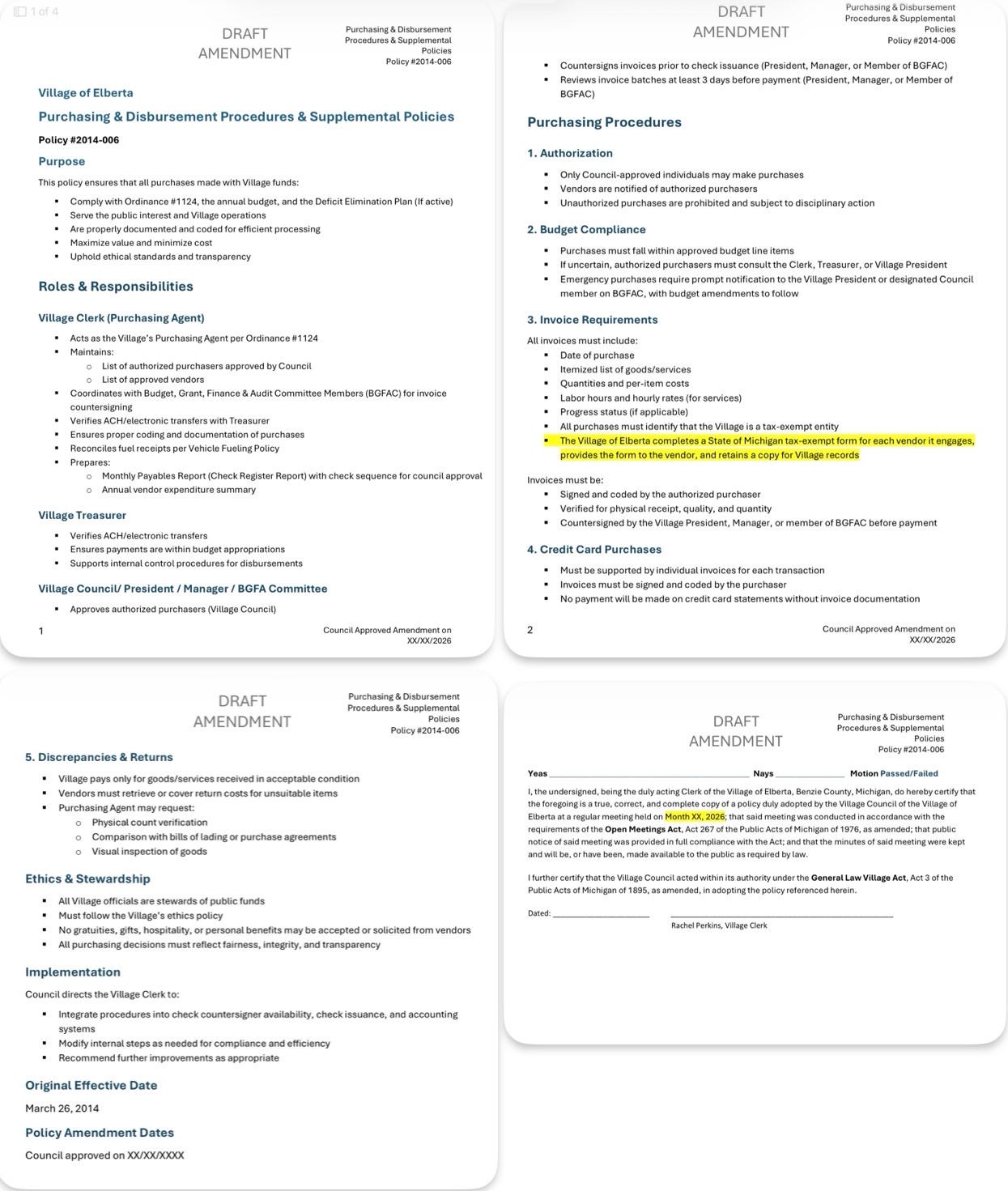 “This amendment updates the Village’s old procedure and reflects current practices, clarifies expectations, and ensures consistency with our broader policy framework, and as with all our Village policies, we run it through the committees, so it’s been through BGFAC and Personnel and Policy and then we run it through the attorneys and make changes that they suggest, and then we take it to Council, and this one has succeeded all three levels. The updates strengthen internal controls, improve transparency, and support staff in applying the procedures accurately,” said the president.