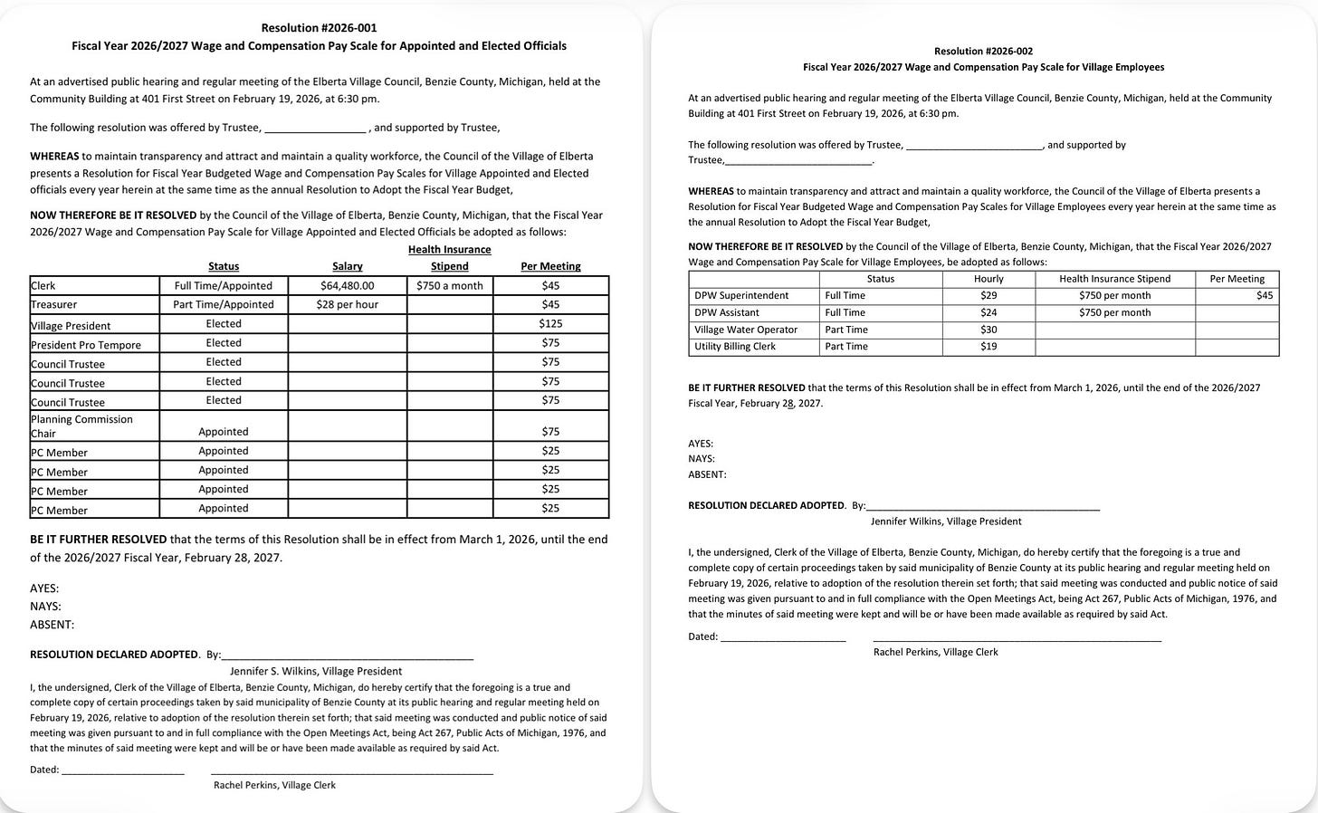 Resolutions 2026-001 Wage and Compensation for Appointed and Elected Officials and 2026-002 Wage and Compensation Resolution for Employees