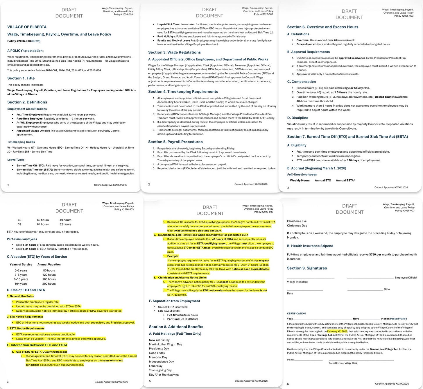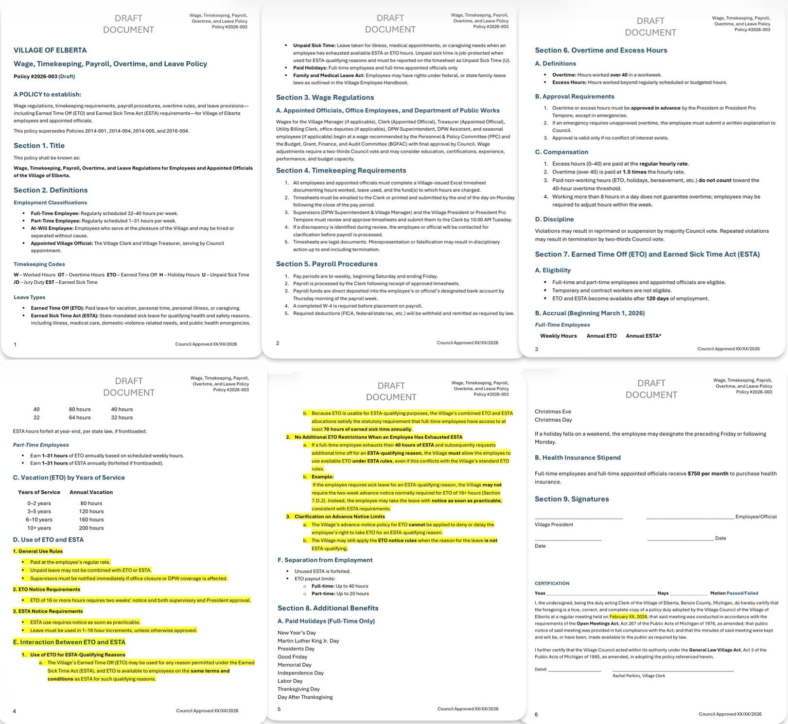 “This one combined a lot of policies together from our old book. We combined wage, payroll, overtime. This policy has been through [BGFAC] and the Personnel and Policy committee and the Village Attorney as well. It includes the new ESTA formulas and all the things that have happened recently. It unifies the policy into one spot whereas they were all separate and not really cohesive. It’s a heck of a lot easier to understand. It will help the clerk tremendously in the payroll process. Over on page 3 where it says that overtime and excess hours must be approved in advance by the President or Pro Tempore, we can add ‘or Village Manager,’ and then if we get one, we get one, if we don’t, it doesn’t matter. Everything highlighted is what the attorney suggested.” Council adopted the policy.