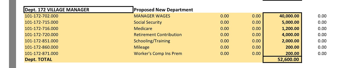 “The General Law Village Act allows a village to employ a Village Manager, and appropriating funds for a potential position is both lawful and common practice. Budgeting for a possible future role does not create the position. It does not restructure the Village government and does not constitute any due process action. It simply reserves financial capacity should the council choose to move forward at a later date. If the council decides to formally establish the Village Manager position, that action would occur through a separate public process consistent with General Law Village Act and practice. The inclusion of the department in the draft budget is a planning mechanism and does not on its own establish the office or authorize hiring. It is simply to show that we can do it.