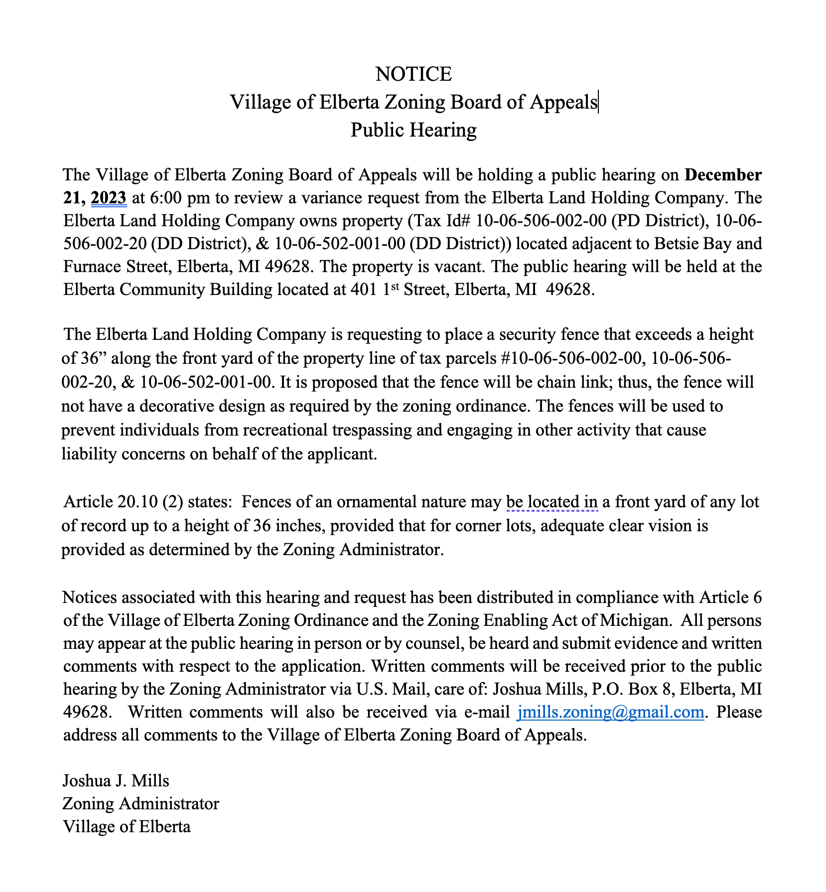 In Elberta, the Zoning Board of Appeals has the same membership as the Village Council. Josh Mills, our zoning administrator, will present the information regarding the variance request and his analysis and t…